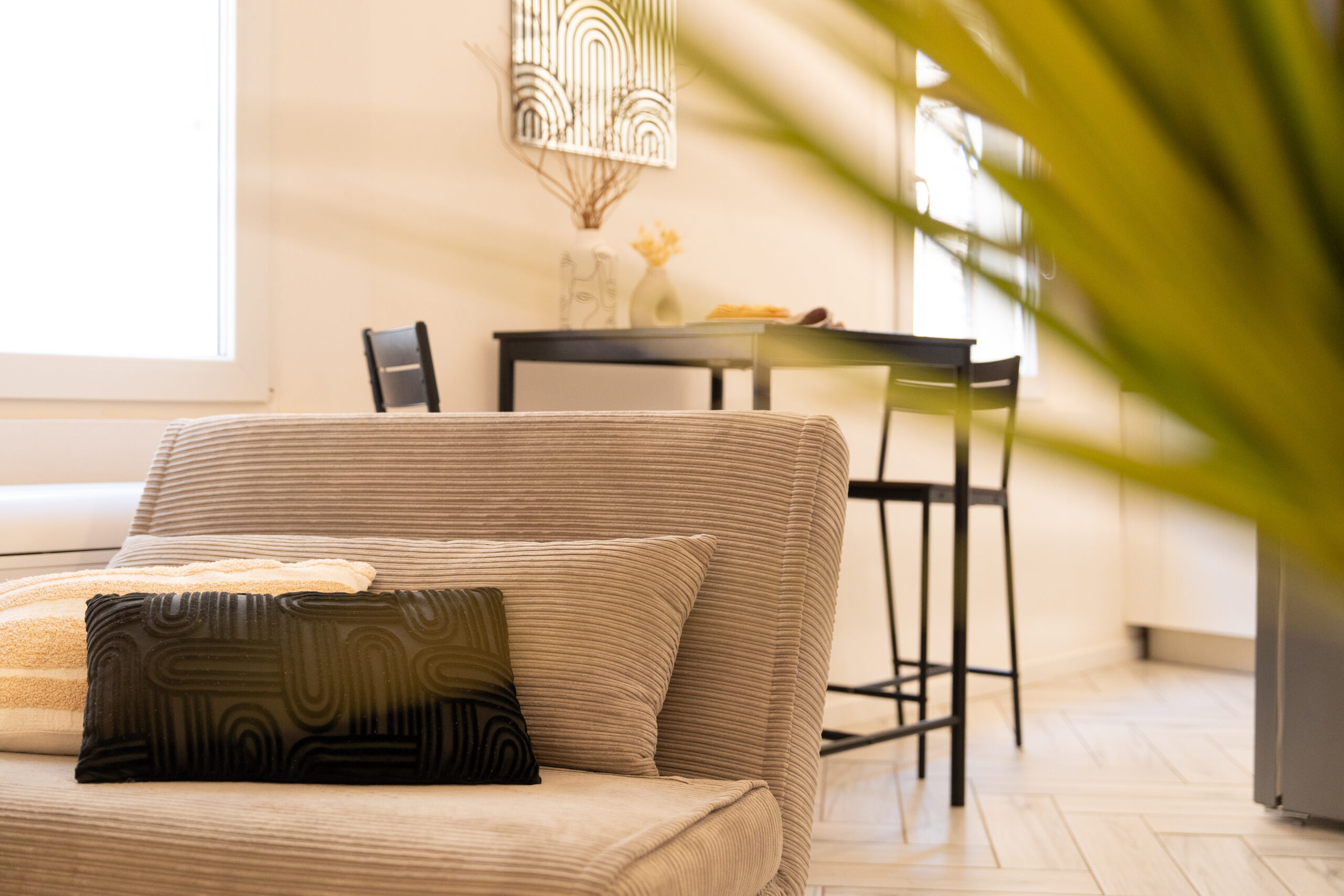 Sabi è uno dei graziosi appartamenti all’interno della palazzina Hygge, situata nel cuore di Ferrara. Lo spazio ospita due o tre persone ed è ideale per chi viaggia per lavoro o per piacere. L’arredamento minimal ed essenziale ha tutto quello che serve per trascorrere un soggiorno confortevole e rilassante. Per garantire massima libertà sull’orario d’arrivo e nel periodo di permanenza, l’accesso all’appartamento è gestito comodamente con il self check-in.